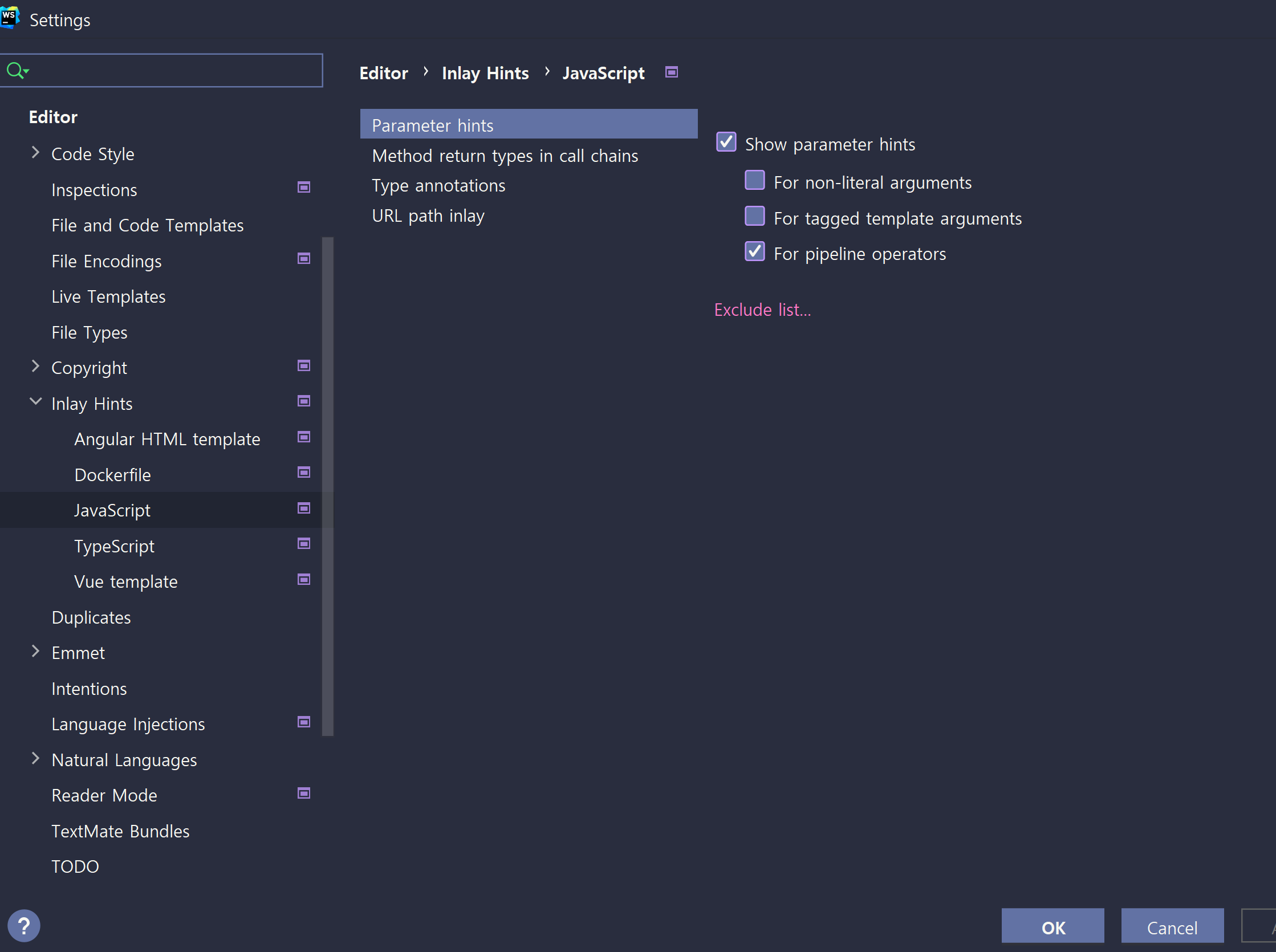 Editor -> Inray Hint -> Javascript -> Parameter hints -> Exclude list