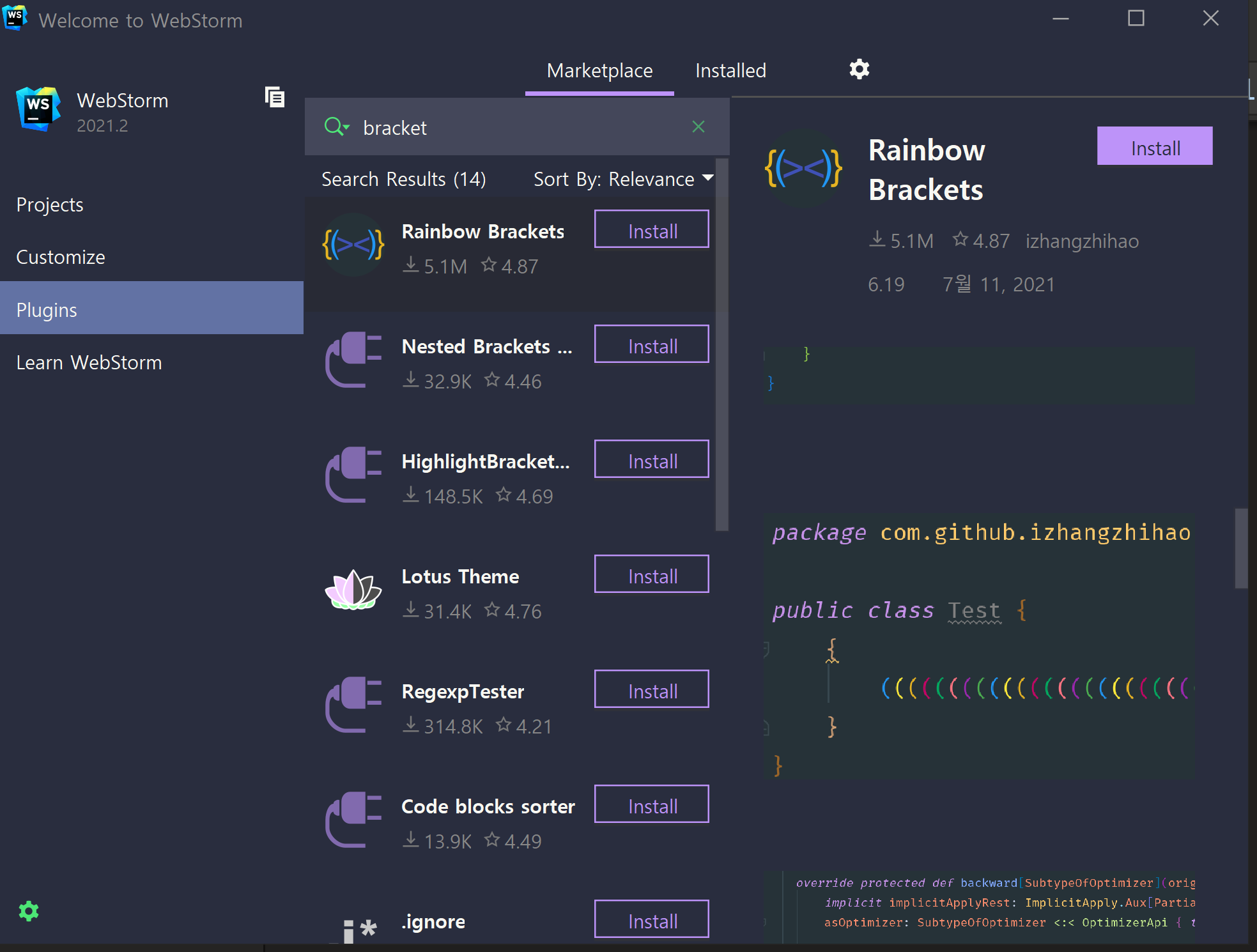 이번에도 역시 vscode에 있는 bracket pair colorizer 에 대응하는 Rainbow Bracket을 설치해보았다.